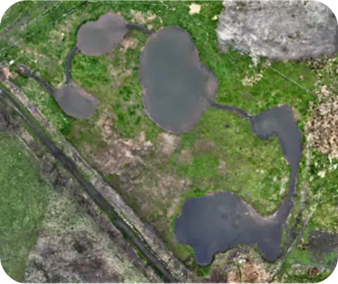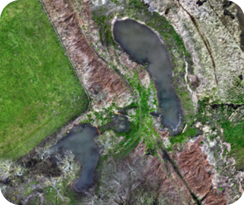 Five wetland/settlement systems were created (ten ponds in total). Four connect to field drains, and one enhances an existing ditch and reedbed. Bunded settlement ponds with coir roll seepage barriers were installed in the ponds connected to field drain outlets, and at the reedbed site a multi-cell system with coir roll barriers and a leaky dam was formed. The largest wetland at this site is the reedbed intervention measuring 0.03 hectares, with 0.07 hectares of wetland habitat created overall at this site.