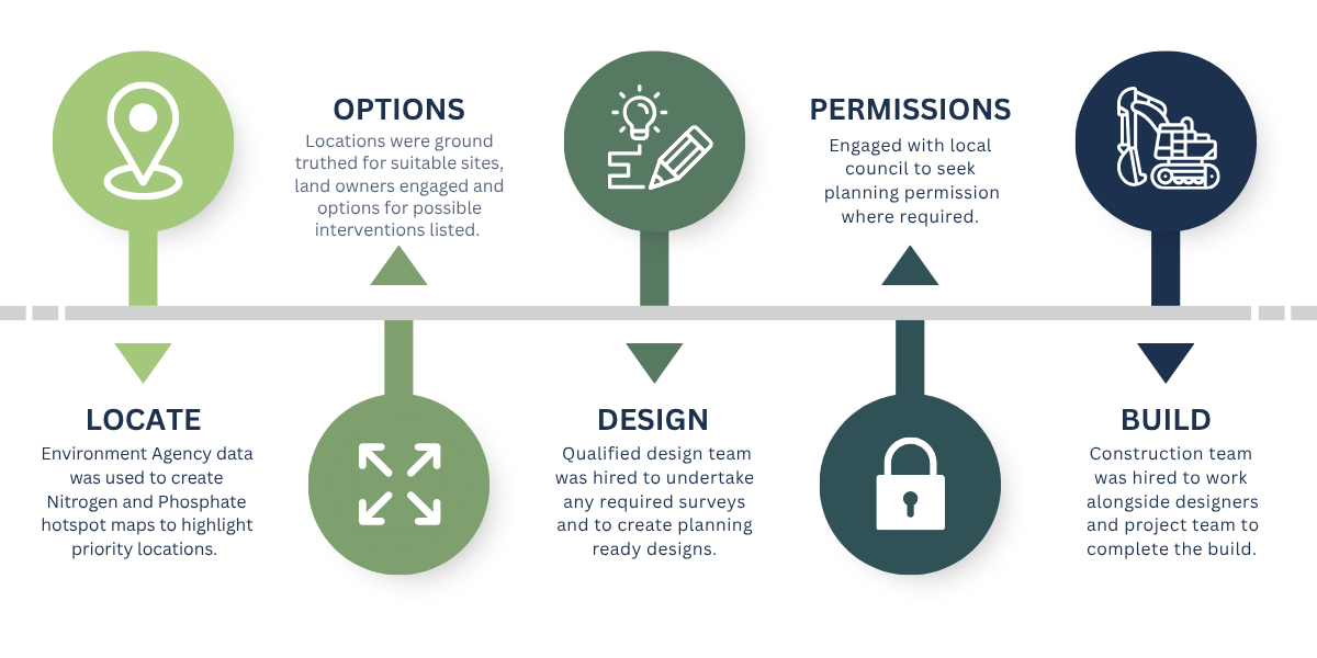 WADER collaborated with local farmers and land managers to install wetland systems around Budle Bay to help stem nutrient and sediment outflow into the watercourse. Wetlands and Sustainable Drainage Systems are simple and effective ways to improve water quality and biodiversity by tackling diffuse pollution. Wetlands have numerous environmental benefits as they filter and capture nutrients, slow water flow, store carbon, create important habitats for wildlife, and boost biodiversity. The journey of wetland creation followed during the project is detailed below. The wetland designs were created by Blue Green Studios.